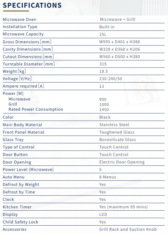 - Model: FV-MW51 x 1 - Built-In Microwave - With Grill - Capacity: 25L - Colour: Black